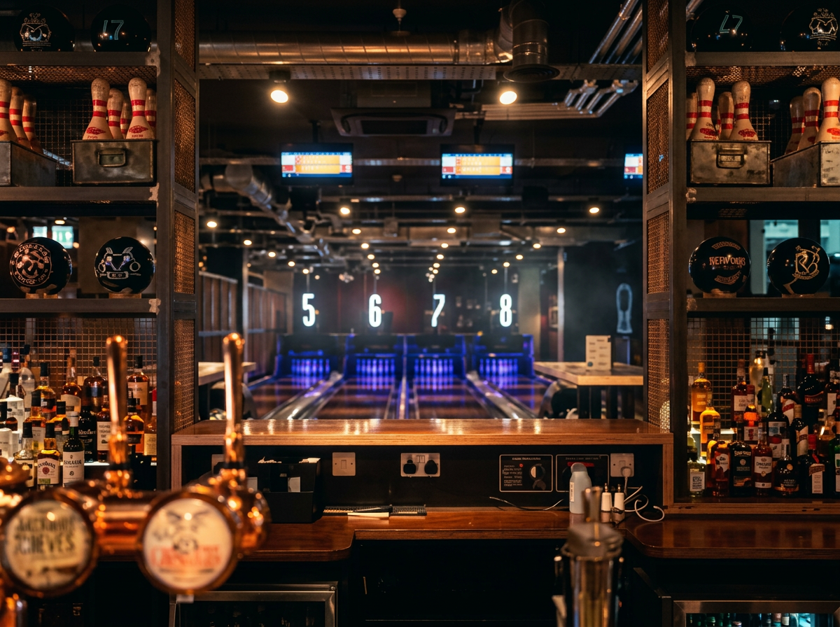 Lanes, classic arcade, long bar, sofas to land on between frames. Order food at the lane.